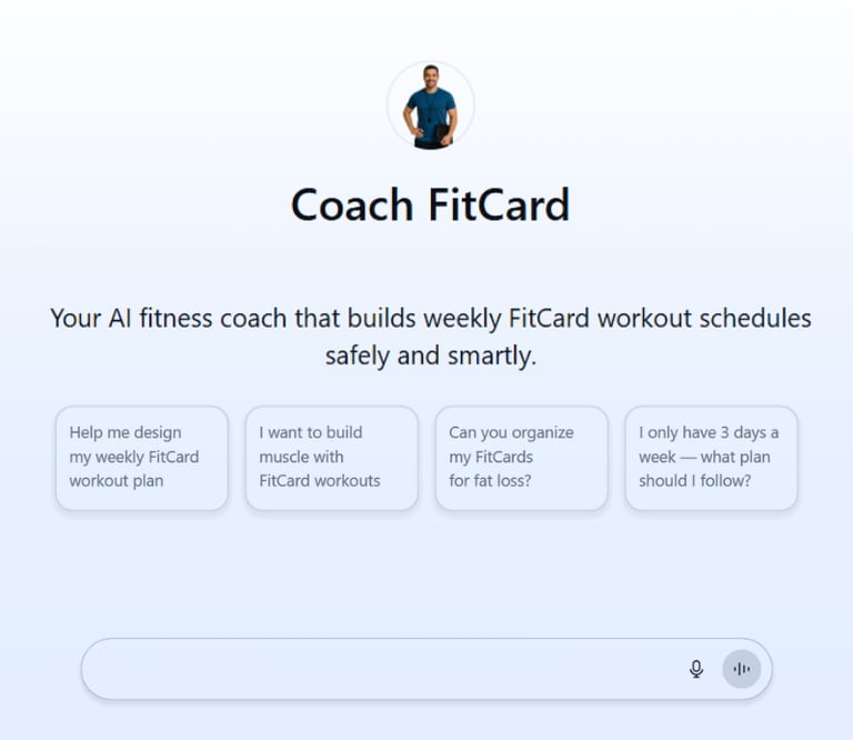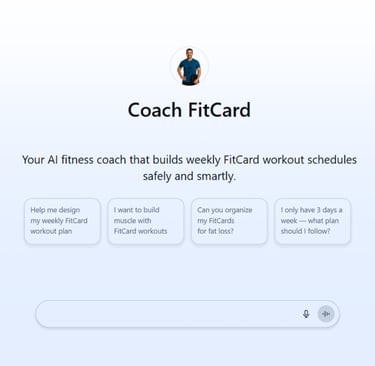 With the Coach FitCard AI Agent, you have a smart personal trainer by your side 24/7. Ask questions about which FitCards to use, how to combine them, and how to build a balanced, practical, and personalized weekly workout plan.